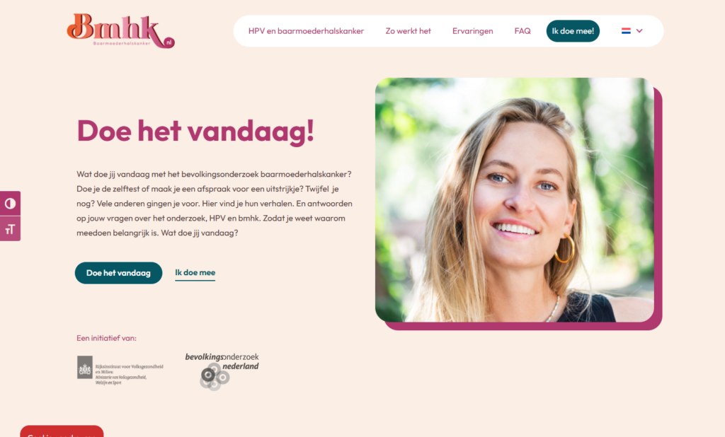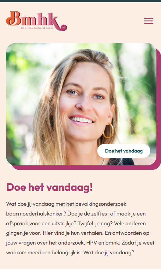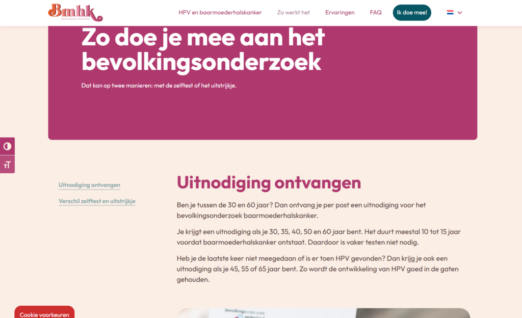 Na mijn stageperiode bij PageKing ben ik parttime bij hen aan de slag gegaan, omdat de samenwerking tijdens de stage goed beviel. Een van de projecten waaraan ik als parttimer heb gewerkt, was de website voor “BMHK – Bevolkingsonderzoek Baarmoederhalskanker.” Deze website biedt uitgebreide informatie over het bevolkingsonderzoek naar baarmoederhalskanker. Ik droeg bij aan het design en ontwikkelde de website in WordPress. Tijdens dit project deed ik waardevolle ervaring op, zowel met het verwerken van feedback vanuit het team van PageKing als met direct klantcontact. Dit maakte het een leerzaam en veelzijdig project.